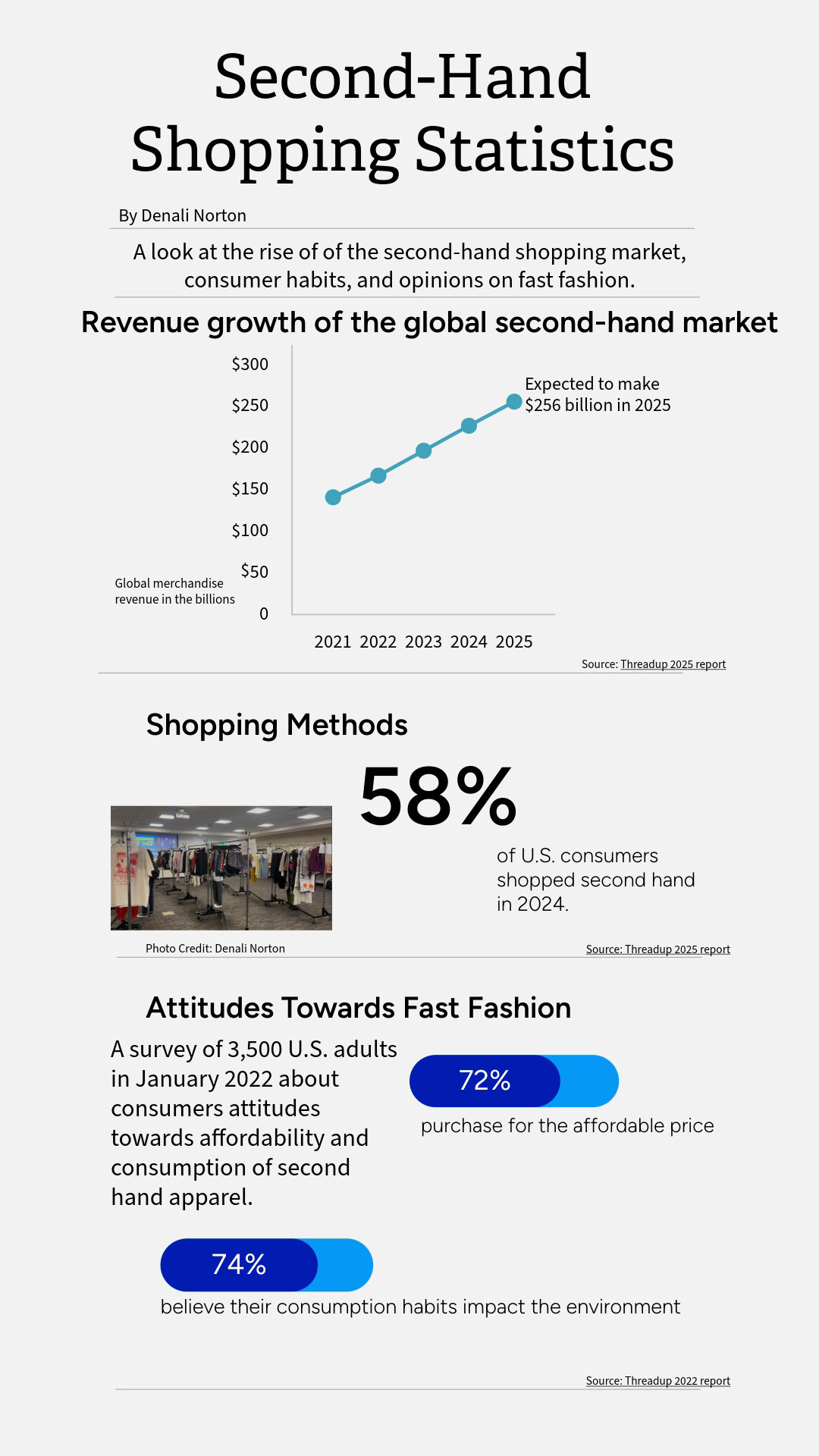 In a culture that values consumption, many young people who are tight on money turn to fast fashion. In 2022, the Threadup Resale Report surveyed 3,500 U.S. adults and found that 72% of consumers stated they shop fast fashion due to its affordable prices. Even though 74% of those surveyed believe their consumption habits impact the environment.